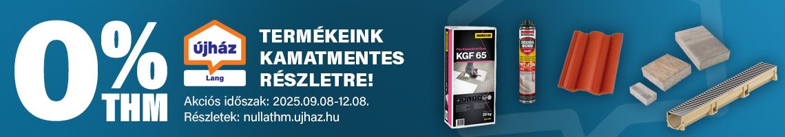 A kamatmentes részletfizetés kizáróIag a kampányban részt vevő kereskedésekben meghatározott termékekre érvényes. A konstrukció az Új Ház Zrt. kijelölt áruházaiban érhető el, a készlet erejéig. Hitelösszeg: 50.000 Ft és 1.500.000 Ft között. Futamidő: fix 20 hónap. Saját erő: 750.000 forintig 0%, felette min. 20%. Éves ügyleti kamat: 0%, THM: 0%. A hitel nyújtója az OTP Bank Nyrt. Az Új Ház Zrt. az OTP Bank Nyrt. hivatalos hitelközvetítője. A hitelkonstrukció a 2025. szeptember 8. - december 8. között benyújtott hitelkérelmek esetén vehető igénybe. A pontos termékkörrel, a részt vevő áruházakkal és a részletes feltételekkel kapcsolatban kérjük, érdeklődjön ügyintézőnknél, a weboldalunkon a https://nullathm.ujhaz.hu oldalon vagy a kijelölt áruházakban elérhető Hirdetményből. Ez a tájékoztatás nem minősül ajánlattételnek. A Bank a hitelbírálat és a kondíciók módosításának jogát fenntartja. Az egyes feltételek a hitelbírálat eredményétől függően változhatnak. Reprezentatív példa: 500.000 Ft hitelösszeg, futamidő: 20 hónap, havi törlesztőrészlet: 25.000 Ft, Kamat: 0%, THM: 0%, a kölcsön teljes díja: 0 Ft, a futamidő során fizetendő teljes összeg (a törlesztőrészeltek összege): 500.000 Ft. A THM meghatározása az aktuális feltételek, illetve a hatályos jogszabályok figyelembevételével történt, értéke a feltételek változtatása esetén módosulhat. További részletekről kérjük, tájékozódjon az ügyintézőnknél, weboldalunkon vagy az áruházakban elhelyezett hatályos Hirdetményből, valamint az OTP Bank Nyrt. bankfiókjaiban és honlapján (www.otpbank.hu) közzétett vonatkozó Üzletszabályzatokból.